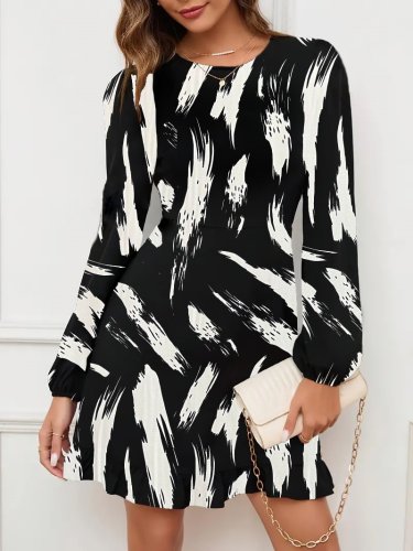 Kadın uzun kollu bisiklet yaka desenli kısa krep elbise