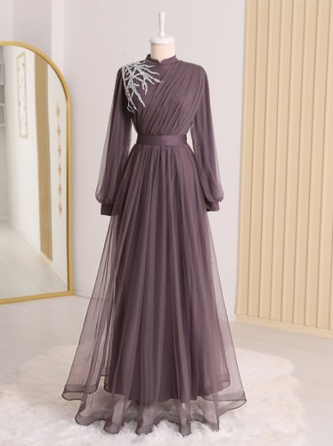 Önü Taş Detaylı Drapeli Kemerli Tül Abiye K Kahve
