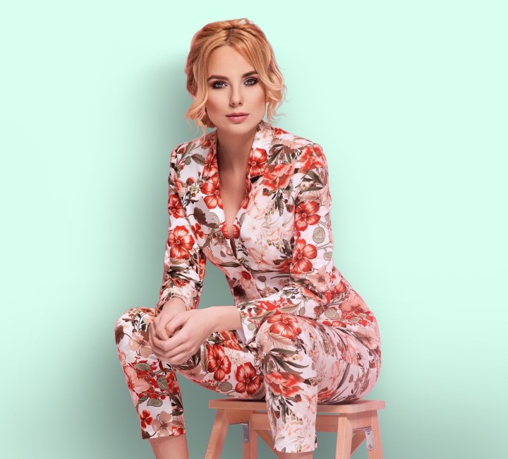 Kadın uzun kollu fermuarlı karışık desenli viskon iki iplik bluz ve pantolon ikili takım