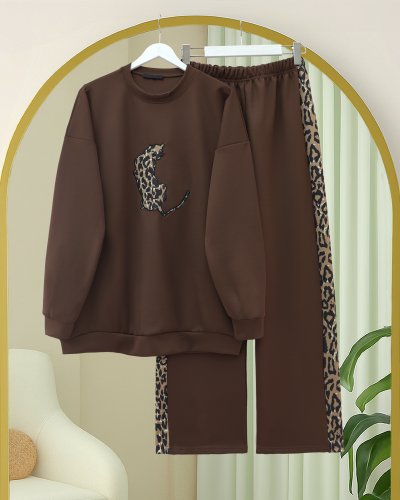 • Leopar Figürlü Ve Desenli Pantolonlu Scuba Takım Kahve